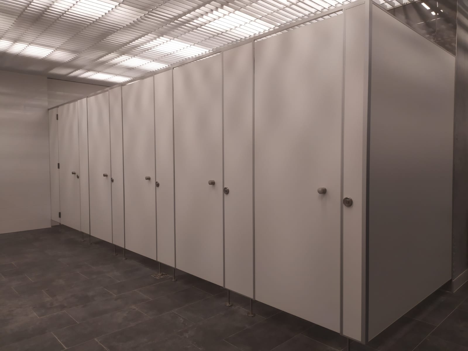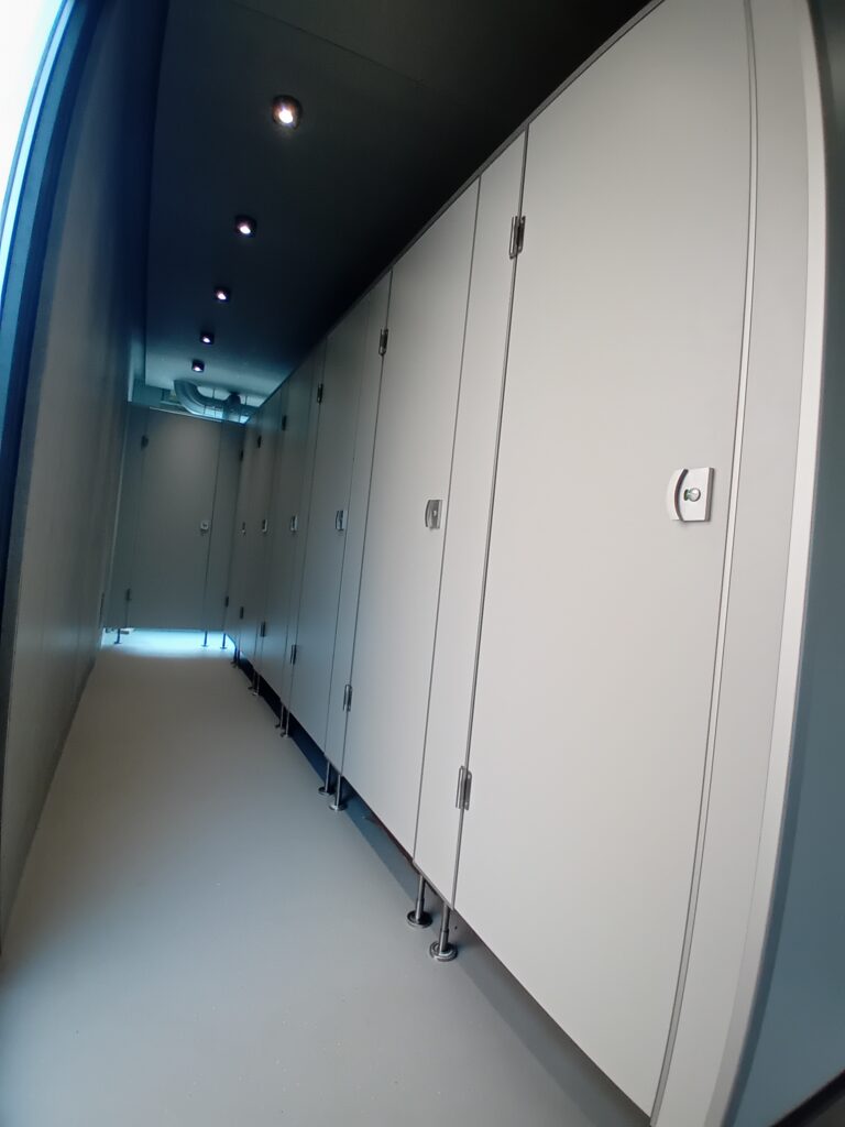 16mm paksused kõrgsurvelaminaadist (KSP) paneelid tagavad niiskuskindluse, kriimustuskindluse ja pika kasutusea ka intensiivses keskkonnas. Tugev alumiiniumraam lisab konstruktsioonile stabiilsust ning korrosioonikindlust, muutes selle sobivaks spordiklubidesse, koolidesse, kaubanduskeskustesse ja muudele ühiskondlikele aladele. Moodulsüsteem võimaldab paindlikku paigaldust ja kohandamist vastavalt ruumi vajadustele. Lihtne puhastatavus ja vastupidav disain tagavad hügieeni ning madalad hoolduskulud.